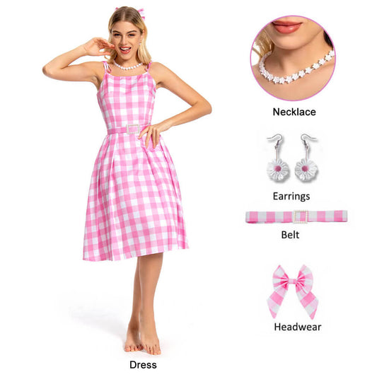 Movie Outfits Doll Babara Pink Plaid Dress with Earrings and Necklace